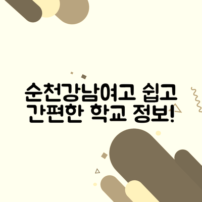 순천강남여자고등학교는 전라남도 순천시에 위치한 사립 고등학교로, 1984년에 개교하여 우수한 교육 환경과 인성 함양에 중점을 두고 있습니다. 이 학교는 ‘참된 생활’, ‘바른 마음’, ‘고운 품성’을 교훈으로 삼고 있으며, 학생들의 전인적인 성장을 추구합니다.
